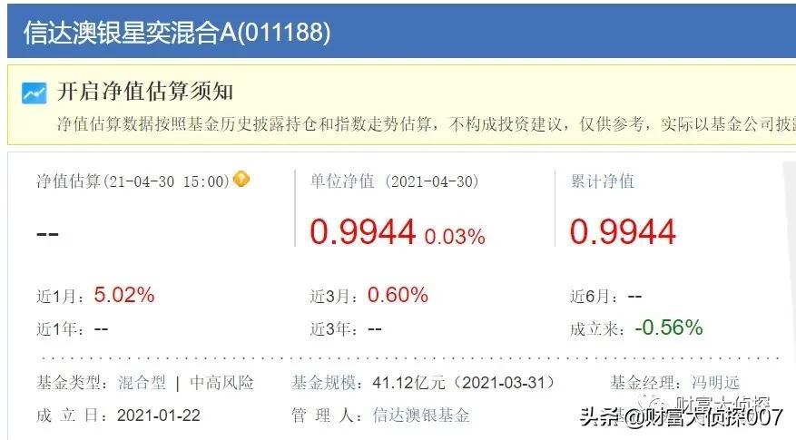 冯明远执掌的信达澳银星奕混合A、C于今年1月份成立,不到四个月的时间,两只基金的单位净值已经跌破1,任期回报分别为-0.56%、-0.77%。虽然比同类平均跌的少了一些,但可能赢在成立时间短,还在建仓期,仓位还不是很重,所以避免了大跌。