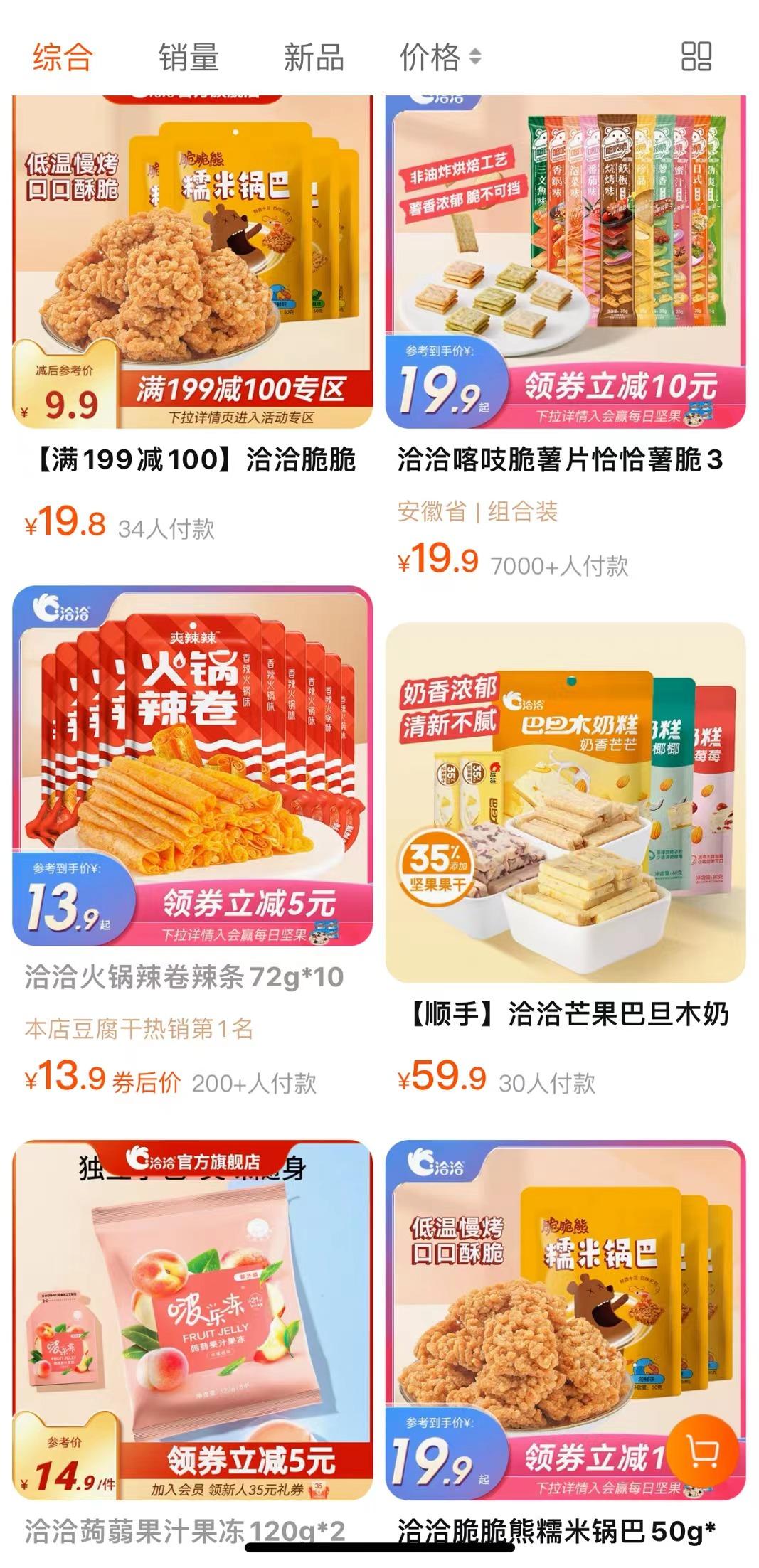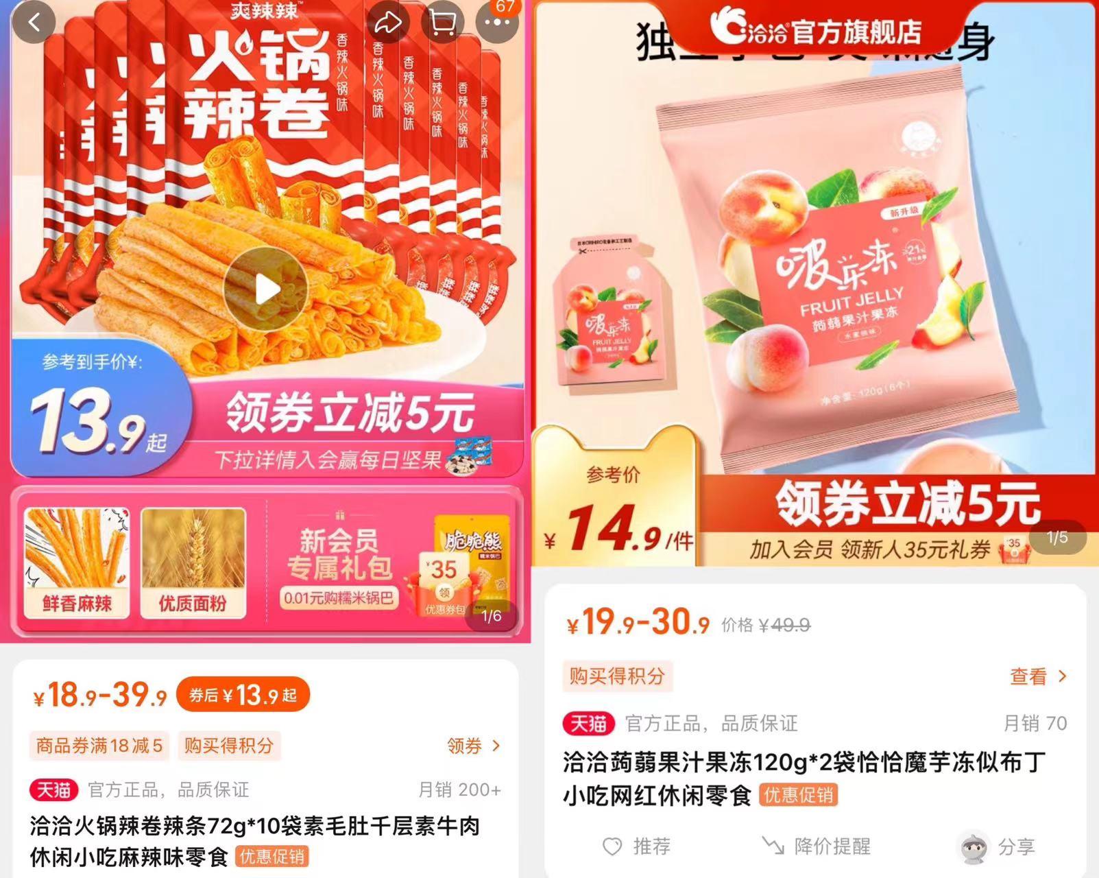 其中,在某电商平台上,其旗舰店中辣条产品的价格显示为72g*4袋18.9元起;果冻价格为120g*2袋19.9元起。